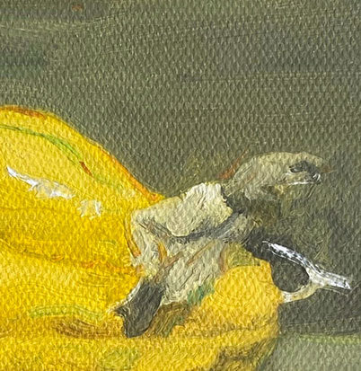 This original oil painting features a bergamot fruit rendered in warm yellow tones against a muted green background. Known for its sculptural form and citrus fragrance, the bergamot has long been associated with Mediterranean culture and botanical tradition.