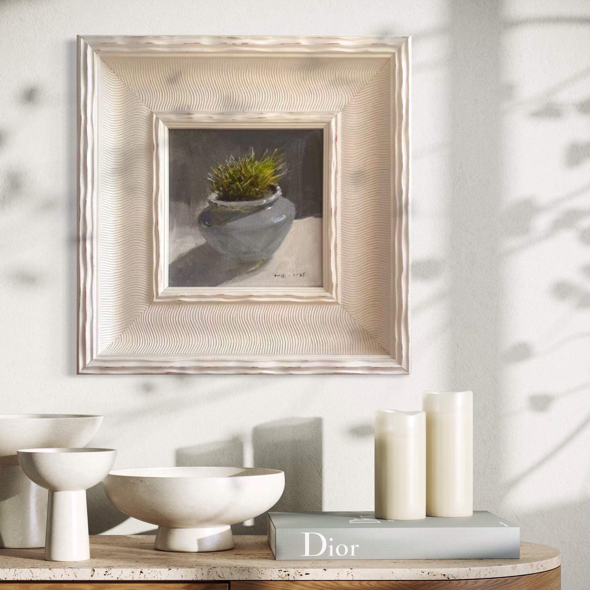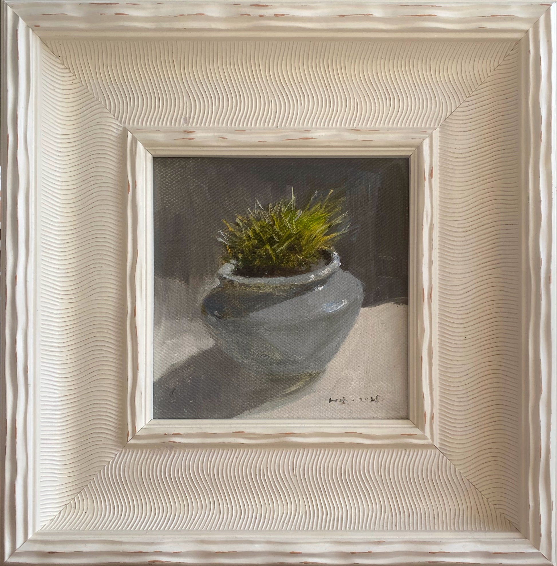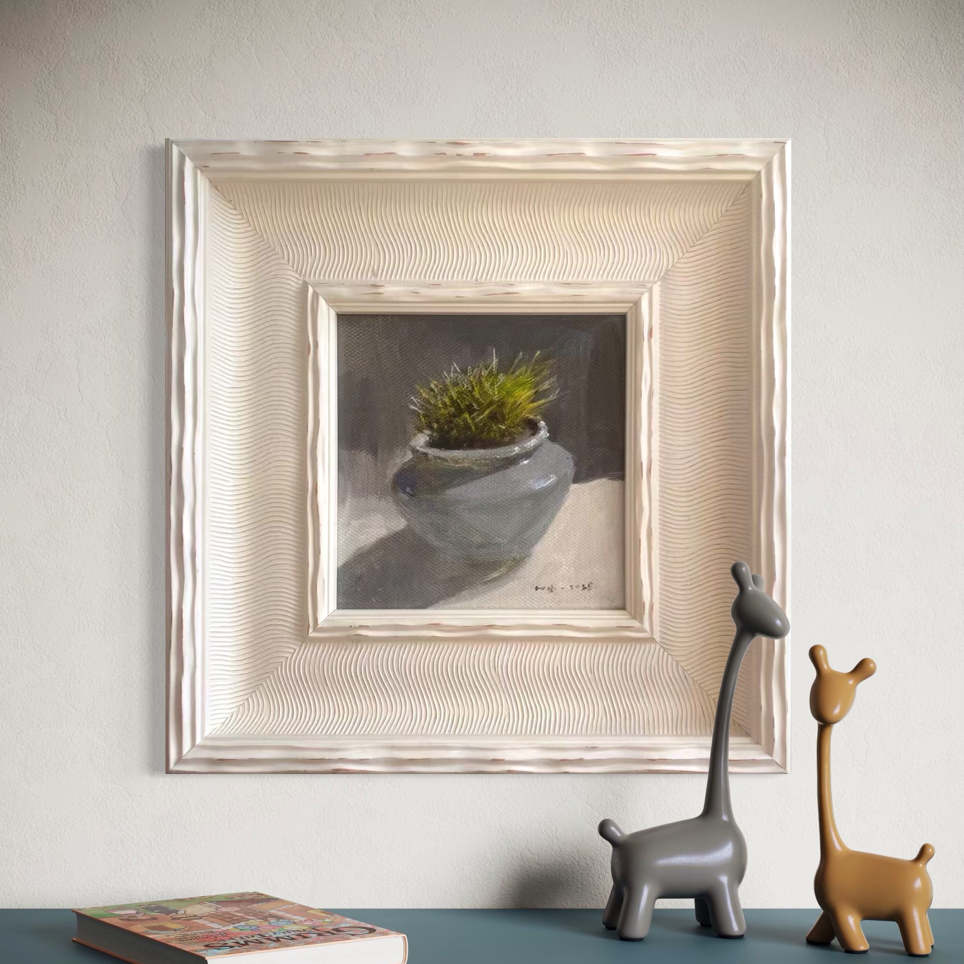 This original oil painting depicts a simple potted green plant resting in a muted ceramic vessel. The composition is restrained and contemplative, focusing on balance, texture, and subtle shifts of light and shadow.