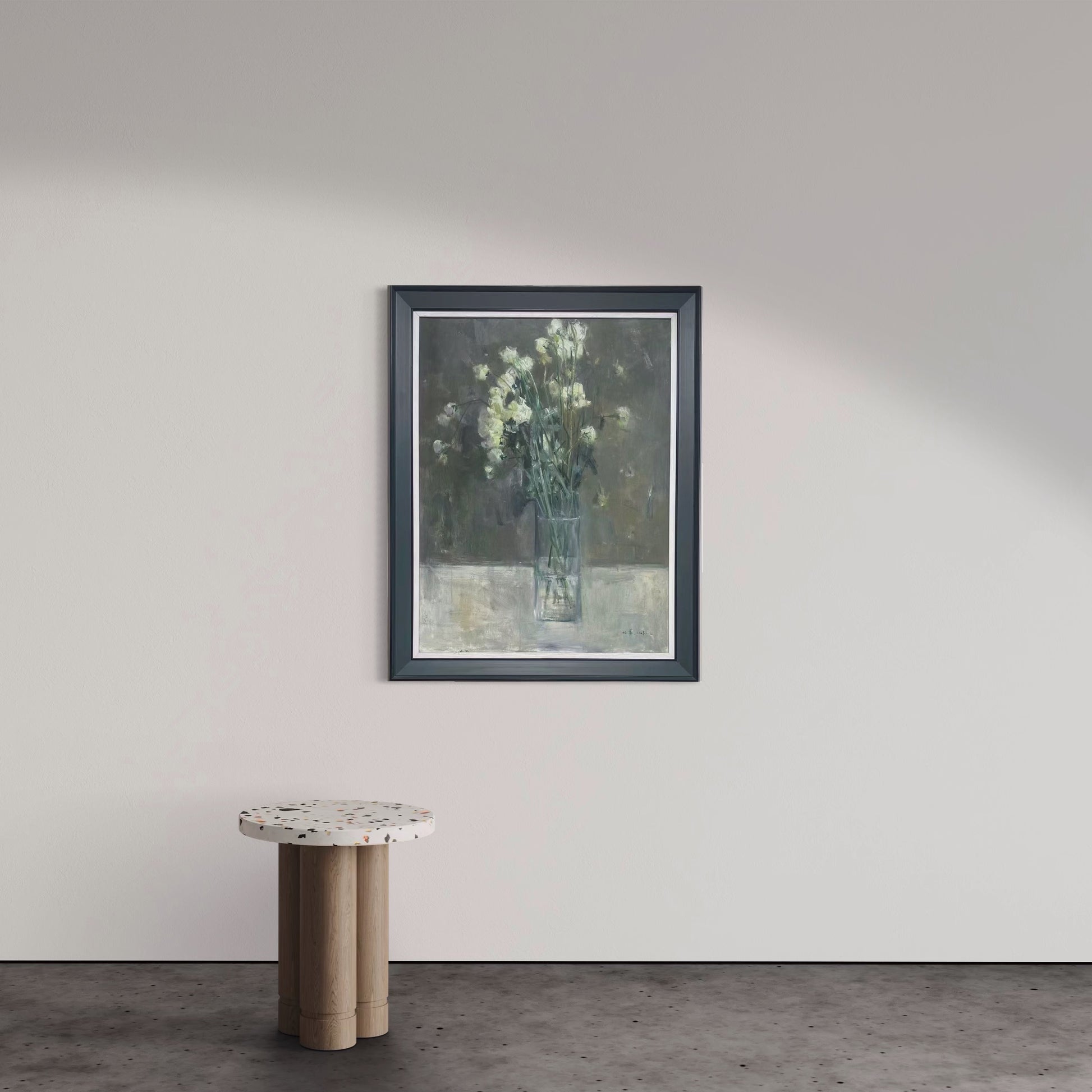 White Flowers in a Glass Vase presents a quiet still life centered on light, space, and balance.