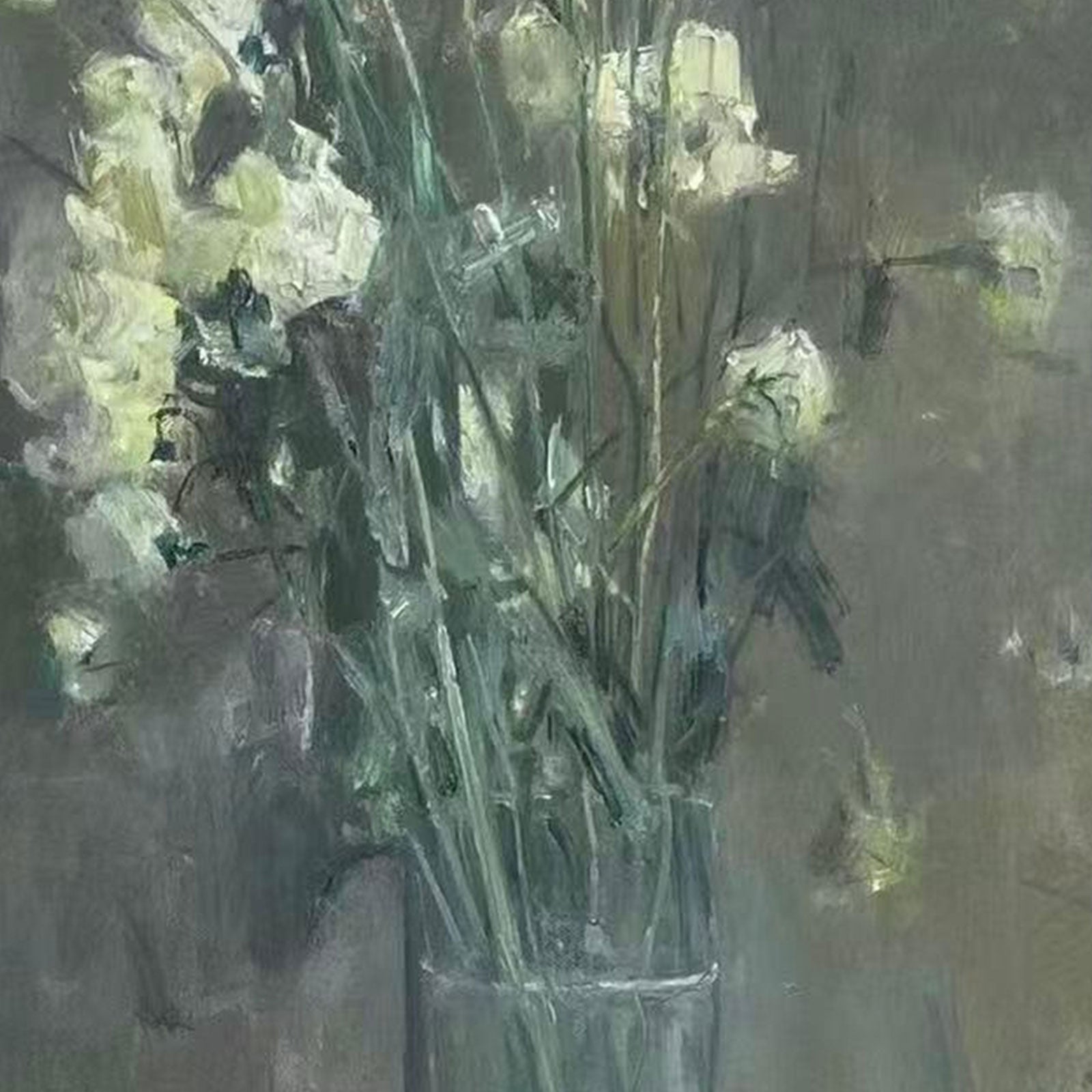 The color palette is restrained, built from whites, muted greens, and gentle gray tones. Brushwork is loose and expressive, allowing the surface of the paint to remain visible while maintaining a soft overall atmosphere.