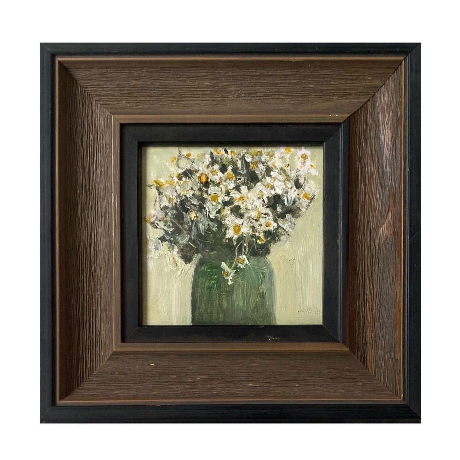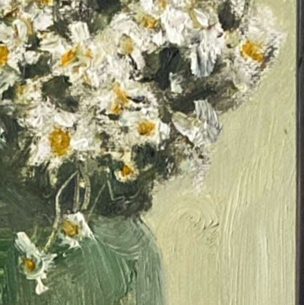This original oil painting presents a delicate arrangement of white wildflowers gathered in a soft green vase. Painted with a restrained palette and subtle brushwork, the composition evokes calm, balance, and a quiet sense of everyday beauty.