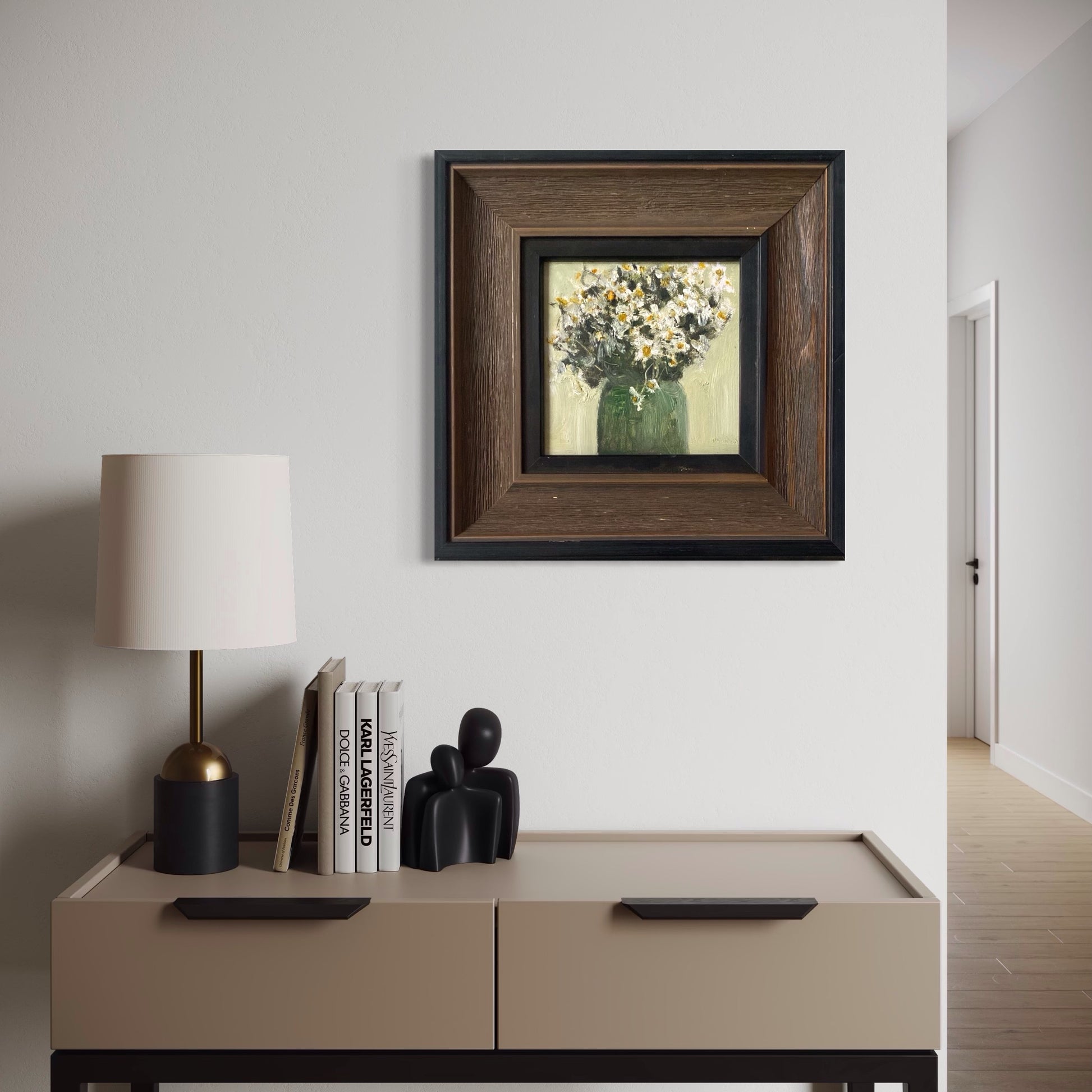 The painting is professionally framed in a dark wood frame, enhancing the softness of the florals while adding visual depth and contrast. With its compact 35 × 35 cm size, this piece is ideal for curated walls, reading corners, bedrooms, or refined living spaces.