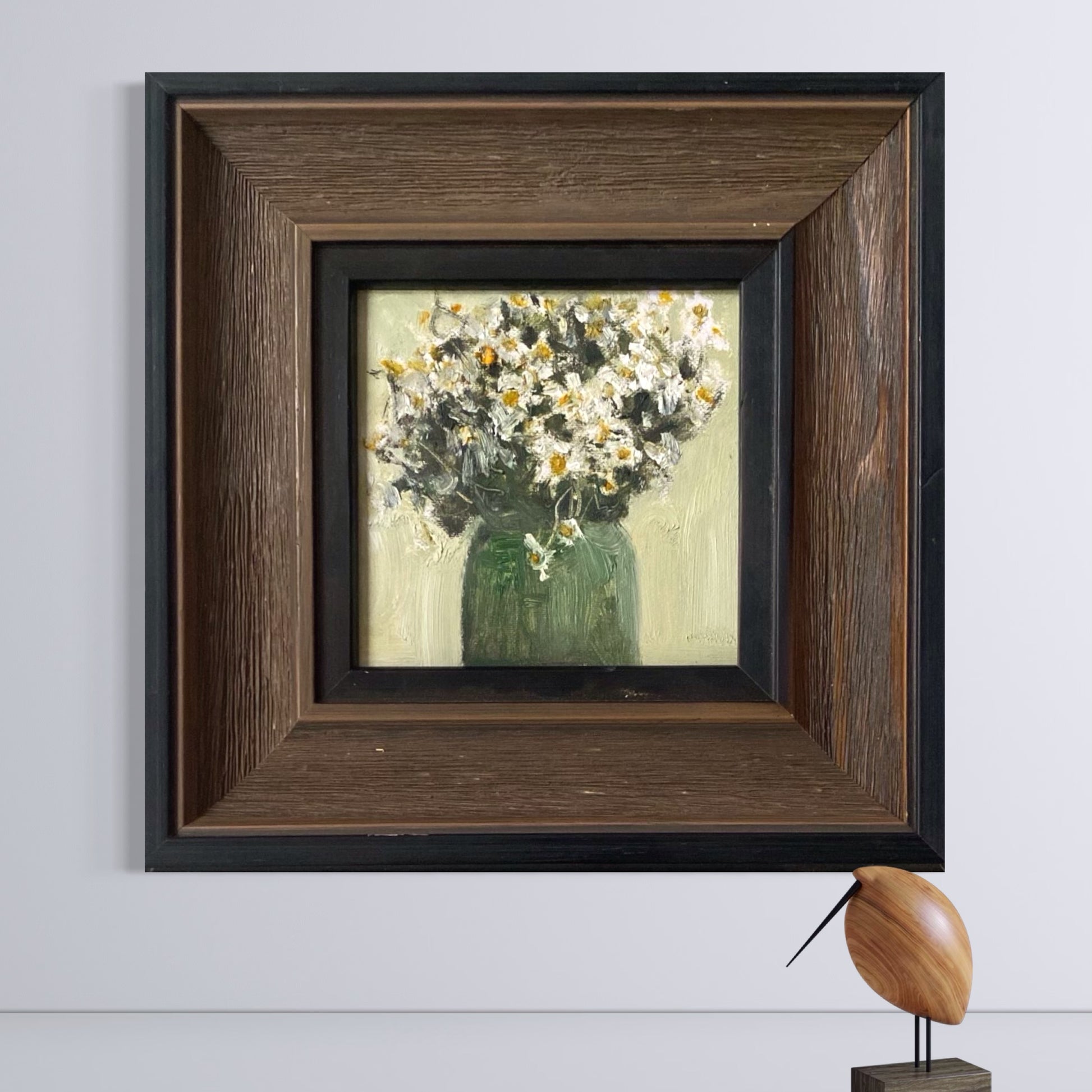 White Wildflowers in Green Vase Original Framed Oil Painting on Canvas, Still Life Floral Artwork (35 × 35 cm)